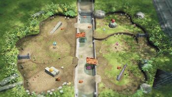 Si svolge su una zona erbosa di forma circolare, tagliata a metà da un canale di scolo prosciugato, con solo alcune pozzanghere d'acqua al suo interno. Su questa mappa, a seconda della variante, si possono usare Pikmin rossi, Pikmin gialli, Pikmin blu e Pikmin alati.
